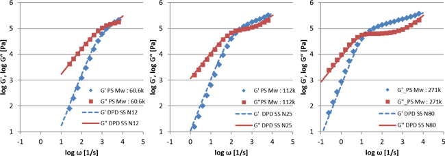 DPDモデルによる粘弾性マスターカーブの作成結果が示されています。絡み合いを考慮したモデルでは、実験結果に近い周波数依存性が得られており、モデルの妥当性が確認されています。