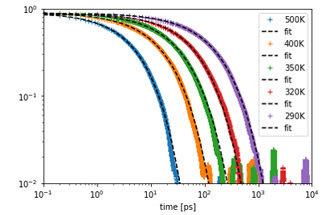 cisポリブタジエンの各温度における双極子モーメントの自己相関関数Φと、それに対するKWW式によるフィッティング結果を示しています。自己相関関数は分子の緩和挙動を反映しており、温度が下がるにつれて緩和が遅くなる様子が確認できます。KWW式によるフィッティングにより、緩和時間の定量的な評価が可能になります。