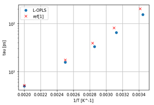 KWW式のフィッティングから算出された緩和時間τを、温度の逆数に対してプロットしたグラフです。このプロットにより、緩和時間が温度に対して指数関数的に変化することが示され、ガラス転移挙動の理解に役立ちます。また、先行文献のデータとの比較も行われています。
