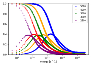 KWW式で得られた自己相関関数をフーリエ変換して得られた誘電緩和スペクトルの実部と虚部を示しています。このスペクトルは、材料の周波数応答特性を表しており、誘電損失や誘電率の周波数依存性を評価するために用いられます。実験との比較により、モデルの妥当性も確認できます。