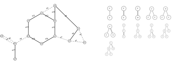 逆解析に用いる分子構造のシード(種)構造と、官能基に相当するツリー構造を示しています。混合整数線形計画法(MILP)を用いて、これらの構造要素を組み合わせることで、目標物性を満たす分子構造を探索します。