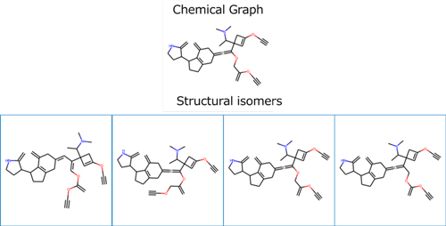 逆解析によって得られた分子構造の例を示しています。構造異性体も含まれており、得られた構造に対して再度順方向の物性推算を行った結果、分配係数は9.8と目標値に近く、逆解析の有効性が確認されました。