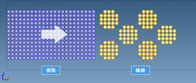 繊維と樹脂を粒子で構成した樹脂浸透モデルを示しています。繊維は粒子を結合させて位置を拘束し、樹脂はx方向から圧力をかけて繊維間に浸透させます。計算は3次元で、各方向に周期境界条件を設定しています。このモデルにより、繊維構造内での樹脂の流動と空隙形成の挙動を詳細に解析することができます。