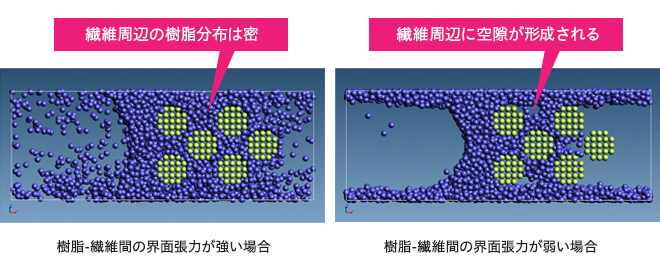繊維と樹脂の界面張力を変化させた場合の繊維間の空隙形成の違いを示しています。界面張力が強い場合(左図)は樹脂が繊維間に密に分布し、空隙が少なくなります。一方、界面張力が弱い場合(右図)は繊維間に空隙が形成されやすくなります。これにより、界面物性が含浸性に与える影響を定量的に評価できます。