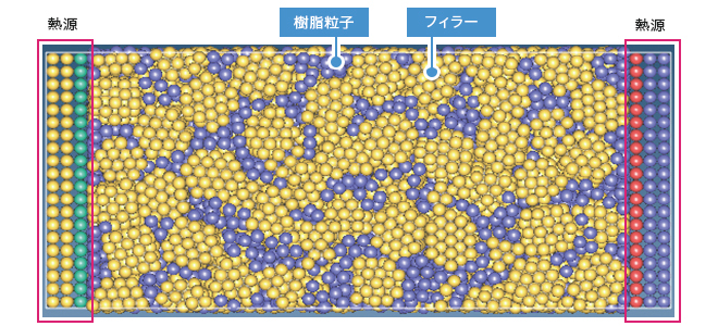 フィラーと樹脂粒子を高密度に充填した構造モデルを示しています。モデルの両端に熱源層を設け、その間にフィラーと樹脂を配置しています。フィラーは複数粒子を結合して構成され、樹脂は単一粒子で表現されています。この構造を用いて、温度勾配と粒子層の厚さからフーリエの法則に基づき有効熱伝導率を計算します。