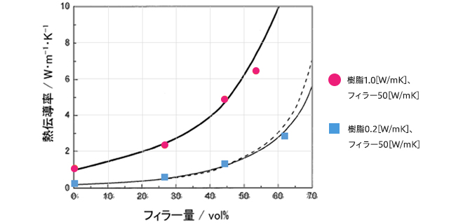 粒子法エンジンVSOP-PSを用いて、フィラー樹脂複合材料の熱伝導率を解析しました。高密度充填構造におけるフィラーの体積分率と有効熱伝導率の関係を評価し、Bruggemanの近似式と比較して良好な一致を示しました。電子機器の放熱設計における材料選定に有用です。
