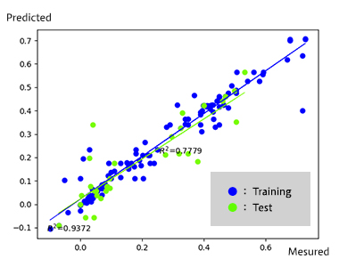 χパラメータの学習結果について示します。学習によって得られた予測モデル(学習済みモデル)に対して訓練セットを使用した場合の予測精度は決定係数ベースで R^2=0.937、テストセットを使用した場合の予測精度は R^2=0.778 となりました。