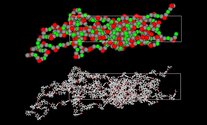 粗視化MDによる一軸伸長のスナップショット(上)と、リバースマッピングによって得られた全原子構造(下)を示しています。粗視化モデルで得られた構造を全原子レベルに変換することで、光学特性の詳細な評価が可能になります。