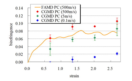 変形速度の違いによる複屈折の変化を示しています。全原子MDでは変形速度が速く、過剰な配向が生じやすいのに対し、CGMDではより緩やかな変形が可能で、実験値に近い複屈折値が得られています。