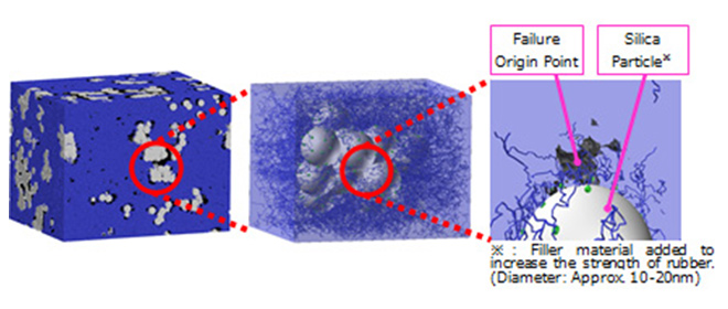 実物を再現するように作成されたゴム材料中のシリカ凝集体の分散構造(一辺350nm)と、粗視化MDによる変形後の状態を示しています。界面での剥離やゴム中のボイドの発生が確認され、破壊の起点となる構造が可視化されています。