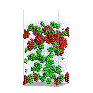 蒸発乾燥後の粒子構造を等値面で可視化した結果が示されています。粒子の分布状態や凝集の様子が3次元的に表現されており、乾燥条件や粒子特性が最終構造に与える影響を評価する上で有用な情報を提供しています。