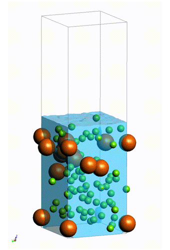 大小2種類のフィラーを含む液膜の蒸発乾燥モデルが示されています。粒子法(MPS)を用いて、蒸発過程における溶媒の減少とともにフィラーが膜表面に凝集する様子を再現しています。このモデルにより、乾燥中の粒子挙動を視覚的に把握することが可能です。