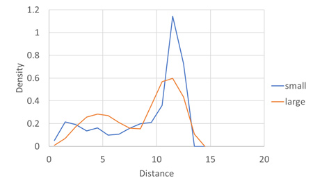 蒸発乾燥終盤におけるフィラーの膜厚方向の密度分布が示されています。小フィラーは大フィラーに比べて膜表面付近に高密度で分布しており、粒子偏析の傾向が明確に現れています。これにより、乾燥後の膜構造における粒子配置の予測が可能です。