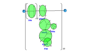 ナフィオン分子をMartini3力場により粗視化したモデルが示されています。1つの粗視化粒子が複数の原子を代表し、計算効率を大幅に向上させています。これにより、ナノスケールでの構造解析が現実的な計算時間で可能となっています。
