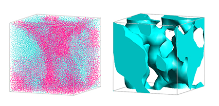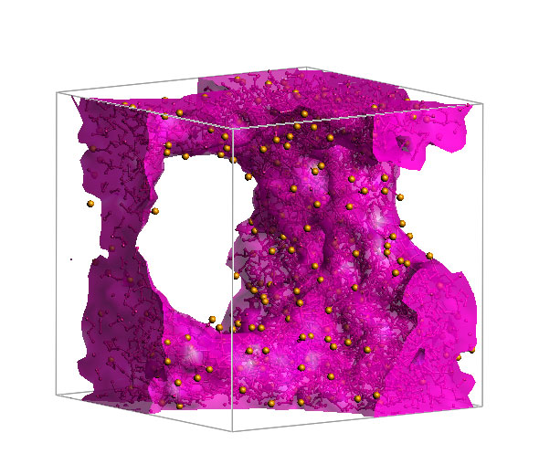 ナフィオン160分子と水24,000粒子を含む大規模モデルによる水チャネル構造が示されています。セルの一辺は18nmで、水の体積分率0.5の等値面を表示しています。この図から、膜内に形成される複雑な水のネットワーク構造が視覚的に確認でき、水の輸送経路や膜の透水性に関する理解を深める上で有用な情報を提供しています。