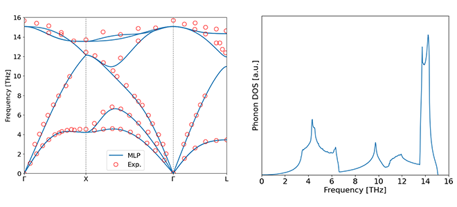 フォノン分散関係は実験値と良い一致を示し、状態密度の計算結果も妥当性を確認できました。左側にフォノン分散関係の実験値との比較、右側に計算されたフォノン状態密度が示されていて、解析の精度と信頼性が高いことがわかります。機械学習ポテンシャルを用いたフォノン解析が有効であることが示されました。