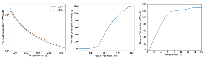 熱伝導率の温度依存性と、平均自由行程およびフォノン周波数に対する累積熱伝導率を示しています。左に熱伝導率の実験値との比較、中に平均自由行程に関する累積熱伝導率、右にフォノン周波数に関する累積熱伝導率が表示されています。これらの解析により、低周波数のフォノンが熱輸送に大きく寄与していることが明らかとなりました。