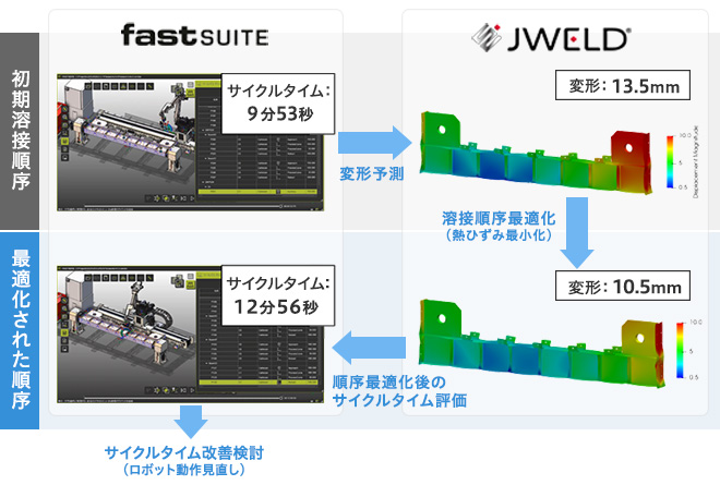 JWELDの最適化機能とFASTSUITE Edition 2を組み合わせることで、溶接変形量を最小化する溶接順序の導出と、導出された溶接手順によるロボット動作のシミュレーションができます。