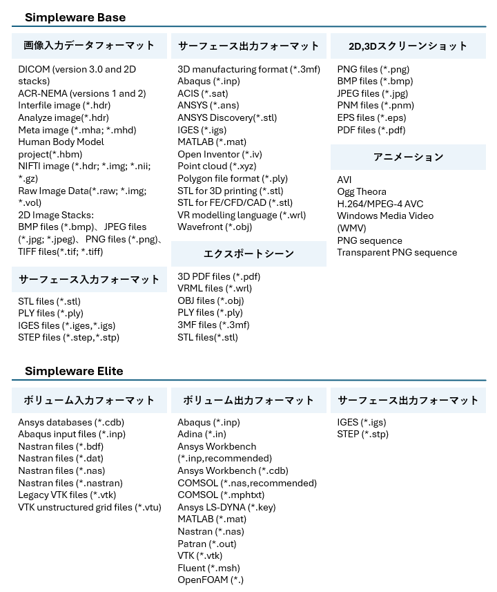 画像データ、形状データ共に非常に豊富な入出力フォーマットに対応しています。特にFE・CFDソリッドメッシュの出力フォーマットは世界中で使用される主な解析ソフトウェアのフォーマットに対応しています。STLファイルはASCII、BINARYの両方に対応しており、またカラー情報を保持したOBJや3MFフォーマットの出力も可能です。
