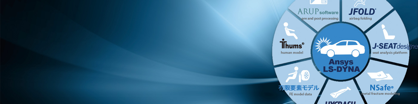JSOLでは、解析ソルバーAnsys LS-DYNAを中心に、条件設定・評価ツールであるArup softwareや、ダミーモデル、衝突バリアモデルなどの有限要素モデルを提供しています。また、JSOLの豊富な経験と知見を活かした自社開発の専用ツールとして、J-SimRapid、JFOLD、J-SEATdesigner、HYCRASHをご用意しています。