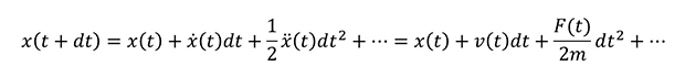 まず MD計算で行われている計算の中身について、簡単に確認しておきましょう。MD計算では、ある時刻における粒子に働く力を計算し、その運動をニュートン方程式に基づいて解きます。これを逐次的に繰り返し、長時間の運動について解析することができます。粒子位置 x の時間変化はテイラー展開により以下のように表せます。