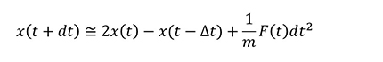 ここで.(ドット)の付いた x は位置 x の時間による一階微分、..(ツードット)が付いた x は二階微分であり、それぞれ速度vと力Fに対応します。実際の MD計算では Verlet の方法などが使用され、導出は省きますが時間積分は以下のようになります。