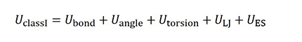 クラスI力場は以下のようにポテンシャルエネルギーU はボンド、アングル、トーションとLJ相互作用、静電相互(ES)作用から成ります。このような力場の代表例として DREIDING、AMBER、GAFF、OPLS などがあります。