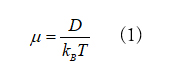 イオン伝導では、イオンの拡散現象の解析を通して電気伝導率を求めることができます。リチウムイオン電池を例に挙げると、解析から求められた拡散定数Dは、Einsteinの関係式(1)により移動度μに変換されて、最終的に電気伝導率が得られます。