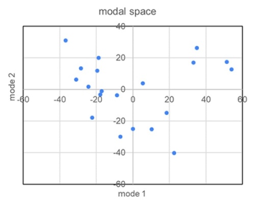 形状類似度の評価における数学的な背景についても先ほどの記事で紹介していますので省略しますが、複数の計算結果の対象形状を統計処理して行います。ある時刻における対象形状の節点群の座標情報から分散共分散行列を作成し固有値計算を行うことで、その時刻における形状の分布をあらわすモード空間を得ることができます。このとき、その空間上の点間距離が離れていれば形状は異なり、近ければ形状が類似しているといえます。