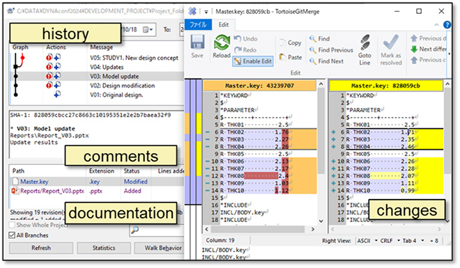 構造計算で用いられる有限要素解析モデルは近年大規模化が進んでいますが、大規模になっているのは節点や形状要素・結合要素の情報がほとんどで、物性や境界条件、計算条件などはそれに比べるとデータとしてはそこまで多くありません。形状変更を含む大規模な設計空間探査のような状況でない限り、モデルの開発やモデルを使った性能開発における検討一つ一つを考えると、各バージョンのモデルに起きる差分はそこまで大きくなく、ソフトウェア開発におけるソースコード管理とそこまで大差はないとも言えます。