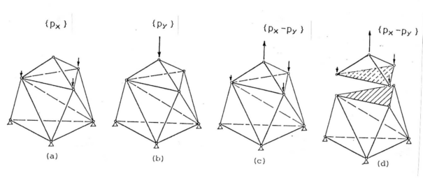 N.J.Hoffは図-5に示すトラスの左端部に合力・合モーメントが0の力を加えた場合を計算し、それによる影響を調べた[13]。その結果、破線の部材がないと、右端部でも無視できない軸力の生じること、又、外殻に相当する部分の破線部を補強しても効果が無く、内部隔壁に相当する破線部が補強されることにより急速に影響が薄れていくことを示した。Y.C.FungはSaint-Venantの原理についての既往の研究を丁寧に紹介している[14]。(訳本に大いにお世話になった[15]。)ただしFungによるHoffへの評価は、従来の多くの考え方と整合していることの再確認にとどまっている。それはA.E.H.Loveにより次のように表現されたSaint-Venantの原理[16]の証明に関する多くの議論との整合性である。