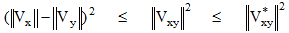 上下界ではさまれた項の||Vxy||2は(c)図に対応したもので合力が0の外力が作用した場合の変形エネルギーの2倍を意味している。この関係式は次の問題とむすびついている。