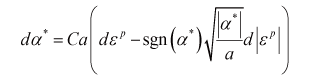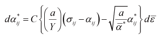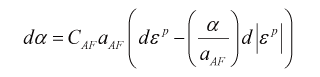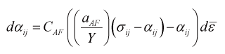 - (2) \(\alpha_{ ij }^{*} \) の移動硬化則では、次式に示すように、動的回復項がA-F modelとは異なっています。
